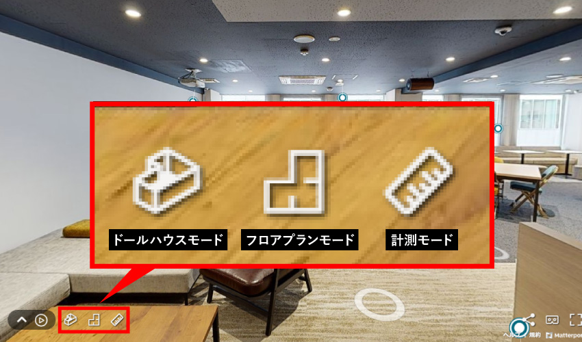空間内を自由に移動できる360°ウォークスルーモードや施設を立体俯瞰できる3Dドールハウスモード、よりリアルなイメージが可能になる天頂フロアプランモードで内覧が可能です。
