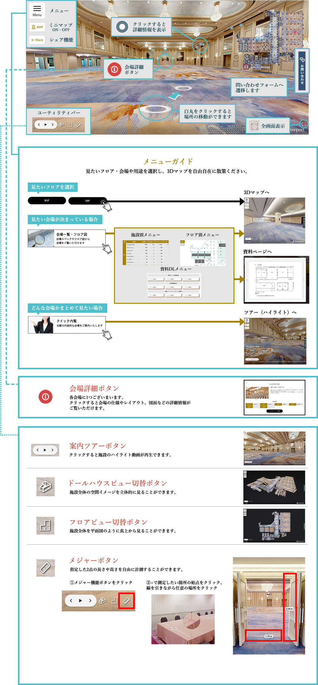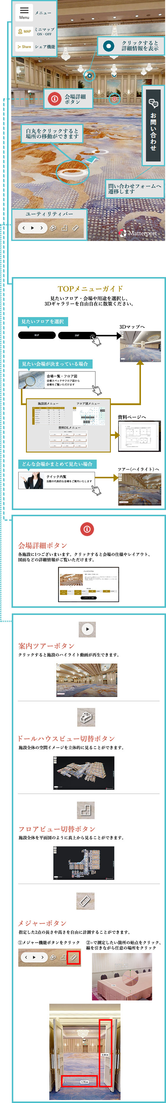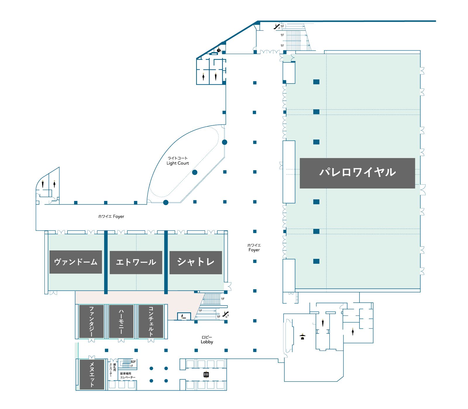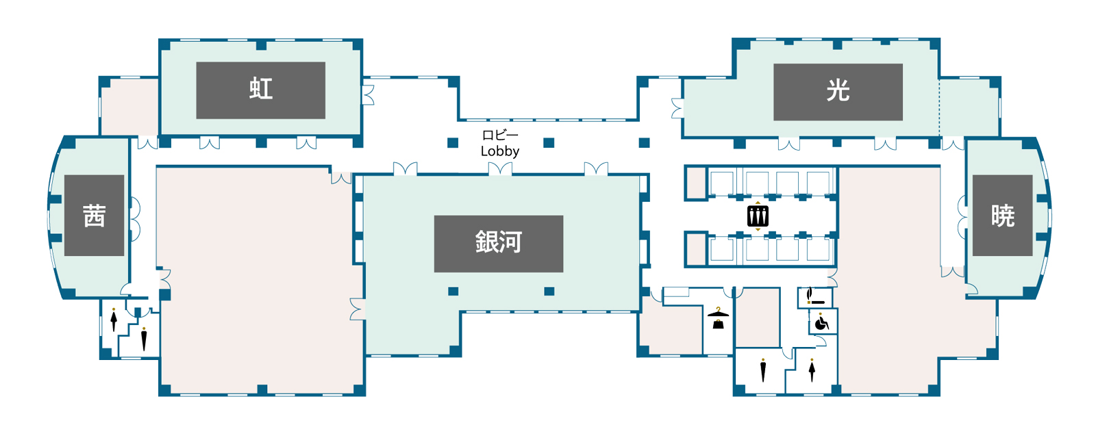 | 階 | 会場名 | 面積(㎡) | 天井高(m) | スクール(名) | シアター(名) | 正餐(名) | 立食(名) | ロの字(名) | コの字(名) |